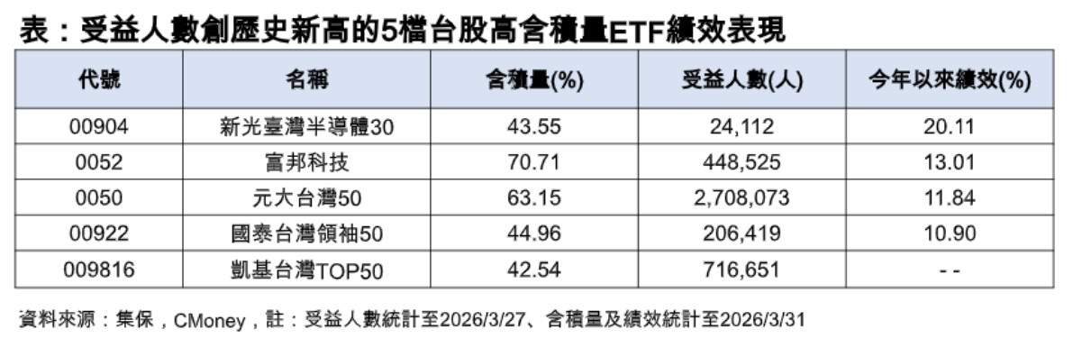 截至3/27止,持有台積電4成以上的台股高含積量ETF中,新光00904、元大0050、富邦0052、國泰00922與凱基009816,受益人數攀升至歷史新高。