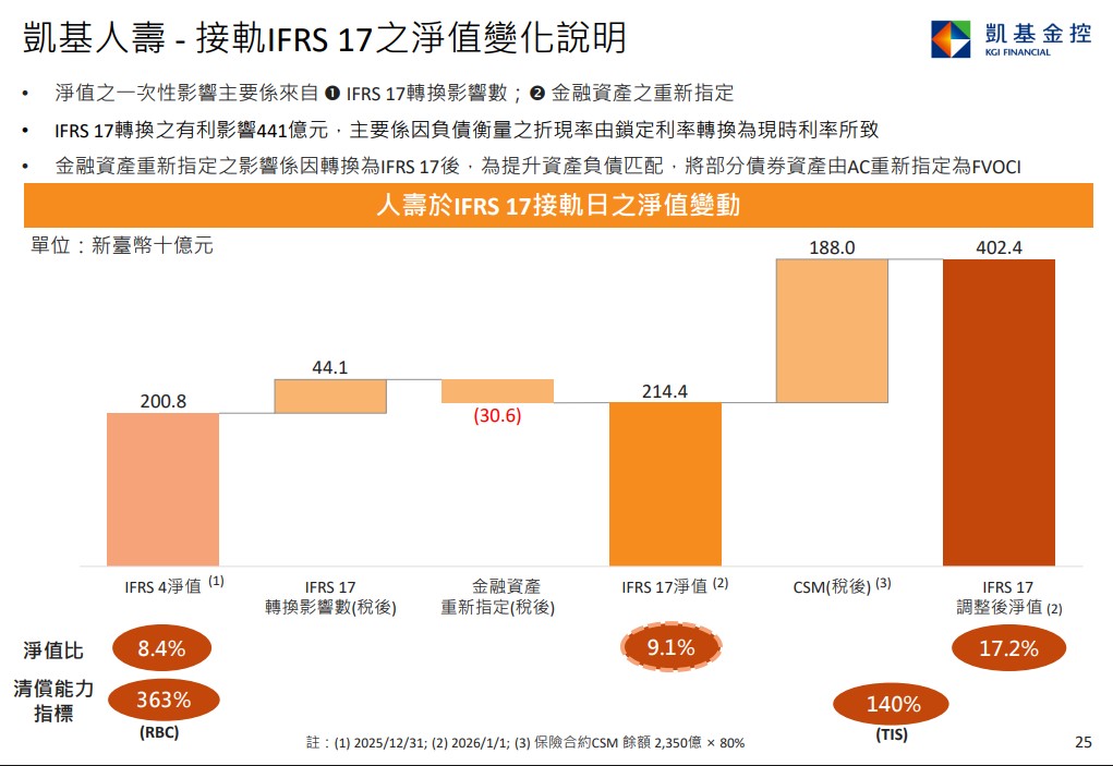 如果加上CSM(稅後)1880億元,凱基人壽調整後的淨值為4024億元;開帳後的淨值比由8.4%提升至9.1%。