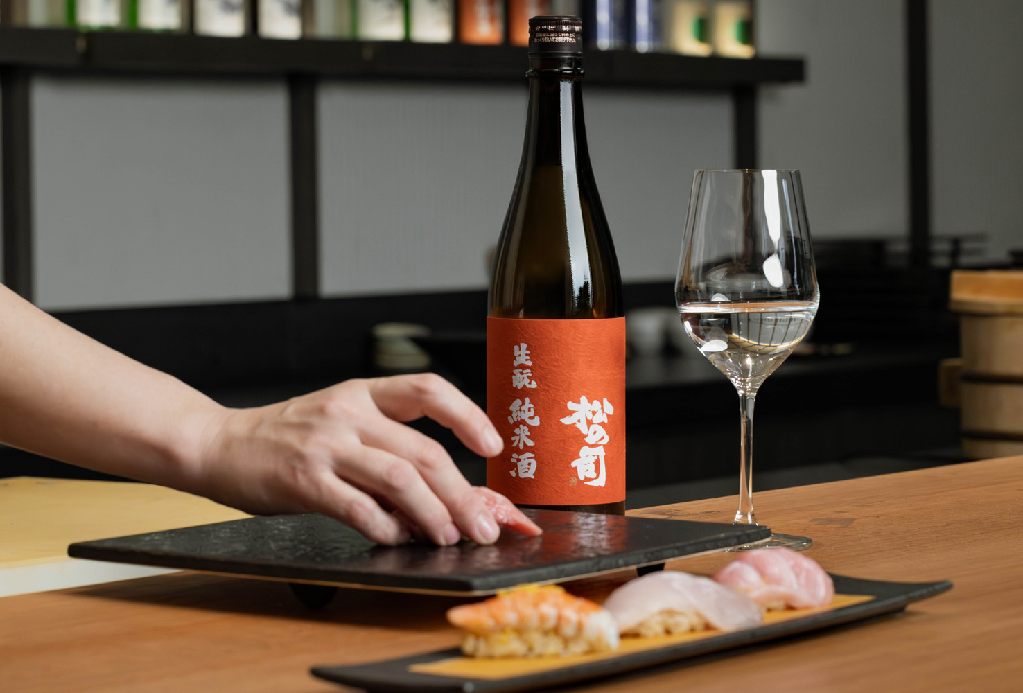 ↑圖說:西村料理長運用「國際唎酒師」專業資格,春季Omakase晚間套餐特別規劃壽司Pairing服務,選用「松之司 純米酒 生酛」佳釀,創造酒與壽司間的完美平衡。(圖片來源:高雄日航酒店提供)