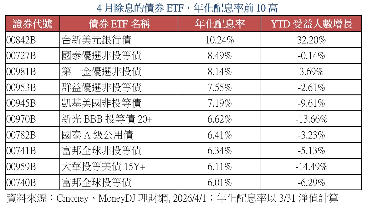 債券ETF四月除息排行 00842B年化配息率逾10%