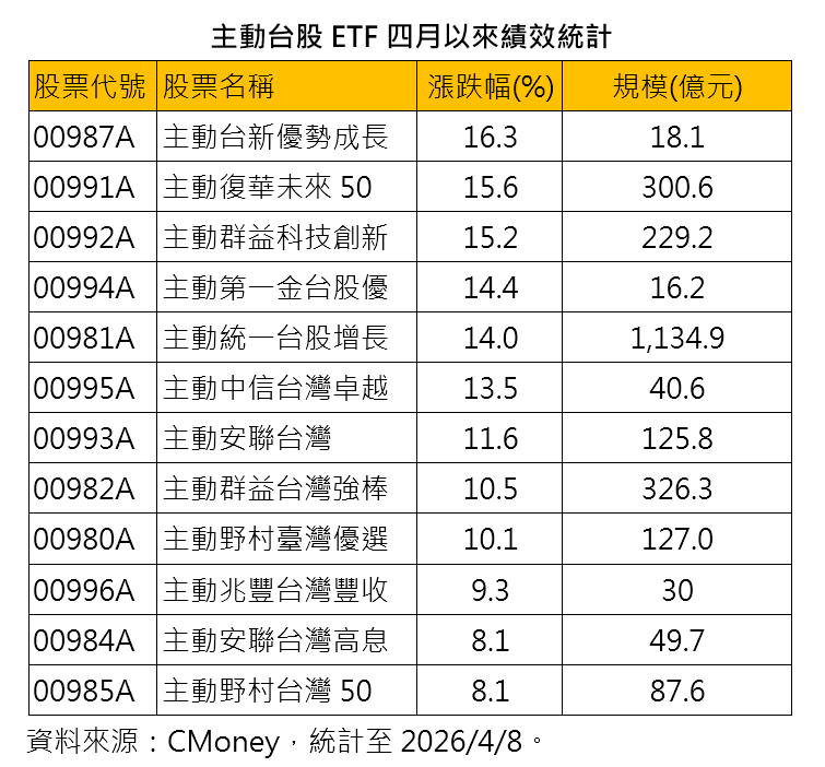 主動式台股ETF今年來平均漲25.19% 4月績效猛將看表秒懂!