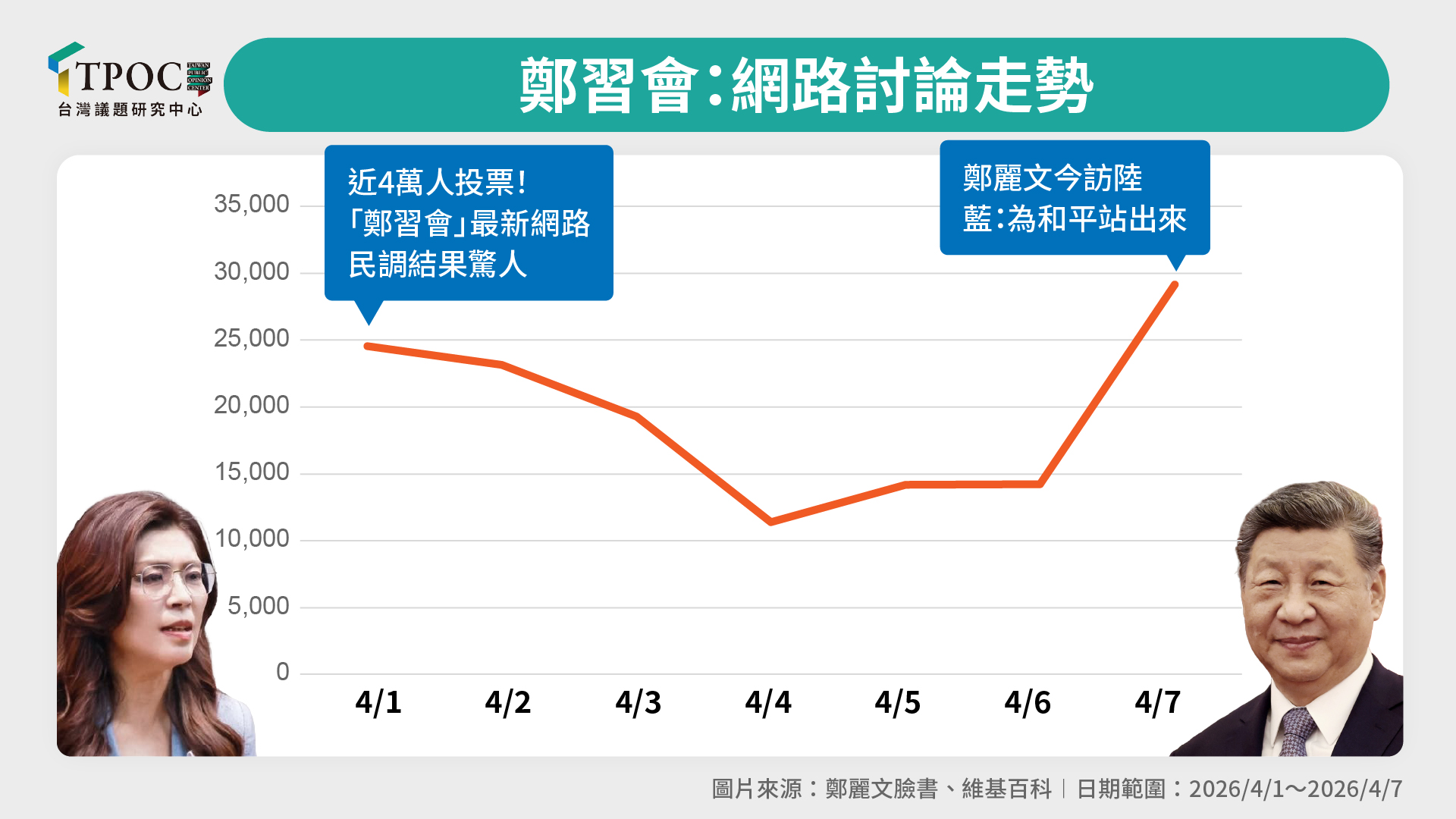 國民黨主席鄭麗文率團訪中進入第三天,昨(4/8)一行人前往南京中山陵參觀,鄭麗文在陵園致詞哽咽,再度引發媒體與社群高度關注。TPOC台灣議題研究中心透過QuickseeK快析輿情資料庫數據,觀察鄭麗文訪中首日的網路聲量逼近3萬則,熱門留言風向中有36%的網友留言表達「支持鄭麗文」,另有31%諷刺「國民黨躺平說」,反映社群對此次行程呈現兩極反應。