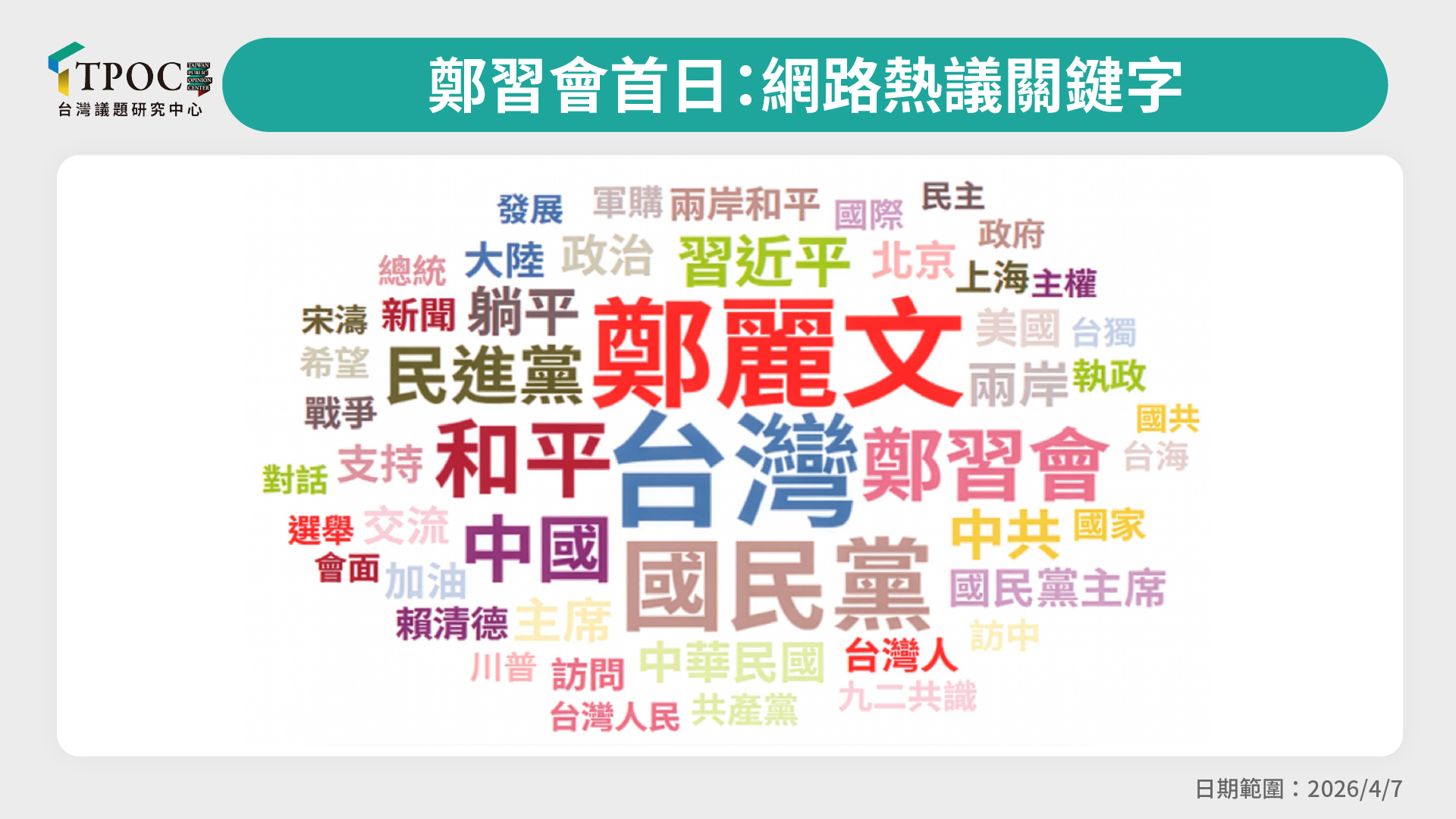 從訪問首日的熱門關鍵字來看,除本次會談主角「鄭麗文」與「習近平」外,「賴清德」亦成為關注焦點。其於7日出席鄭南榕追思會時談及和平議題,表示「和平須沒戰事、保主權」,才稱得上真正的和平,此番言論被外界解讀為對國民黨的隔空回應。在網友態度方面,「支持」、「加油」、「交流」等詞彙反映出對此行持正向或開放態度的聲量;相對地,「軍購」、「主權」、「中共」等關鍵字,則多來自綠營支持者的回應,除強調堅守台灣主權立場外,也呼籲立法院加速審查軍購預算。