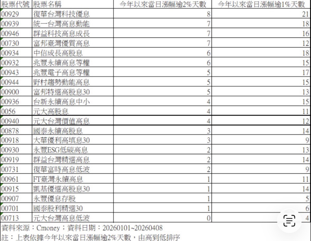 再來看單日表現,復華台灣科技優息(00929)今年以來有8天,單日漲幅超過2%,緊追在後的是統一台灣高息動能(00939)、群益科技高息成長(00946)、富邦臺灣優質高息(00730),則有7天漲幅超過2%,顯示都是經常單日爆發的高息ETF。