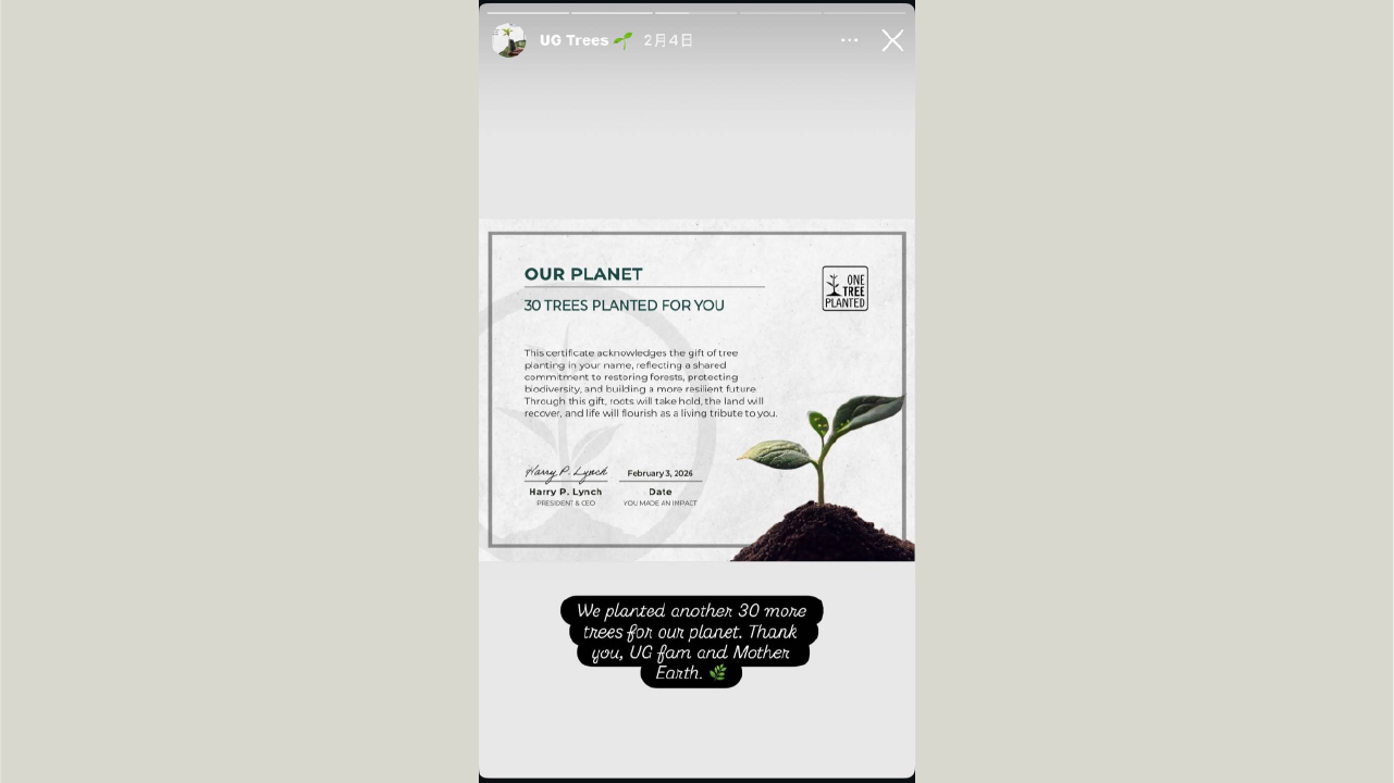 除了展店速度驚人,UG在當地爆紅的另一原因,則是結合環保理念的營運模式。品牌提出「每售出1000杯飲料,即種下一棵樹」的承諾,並與國際植樹組織合作,提供具體植樹證明,將永續行動直接融入日常消費。