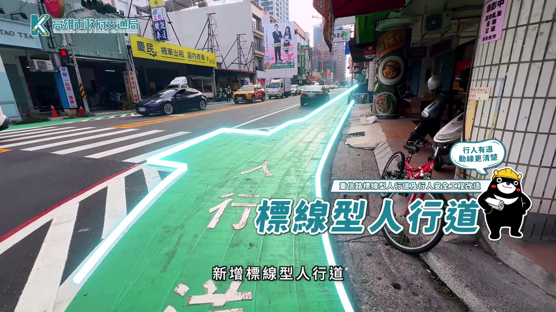 ↑圖說:道路兩側增設完整標線型人行道,讓行人有更清楚、安全的通行空間。(圖片來源:高雄市政府交通局提供)