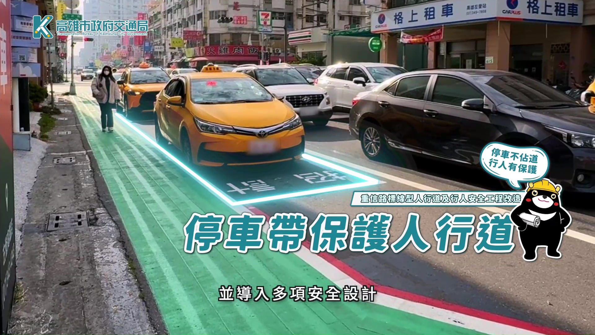 ↑圖說:停車帶保護型人行道設計,降低行人直接面對車流的風險。(圖片來源:高雄市政府交通局提供)