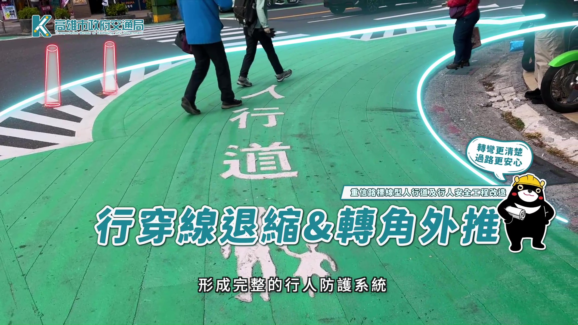 ↑圖說:路口行穿線退縮並將轉角外推,讓行人在路口停等時更有保護。(圖片來源:高雄市政府交通局提供)