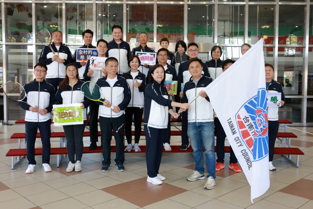 圖說:台南市議會舉行軟式網球代表隊授旗典禮,議長邱莉莉(前中)授旗予隊長李啓維議員(前右),率隊出征全國議長盃,力拚四連霸佳績。