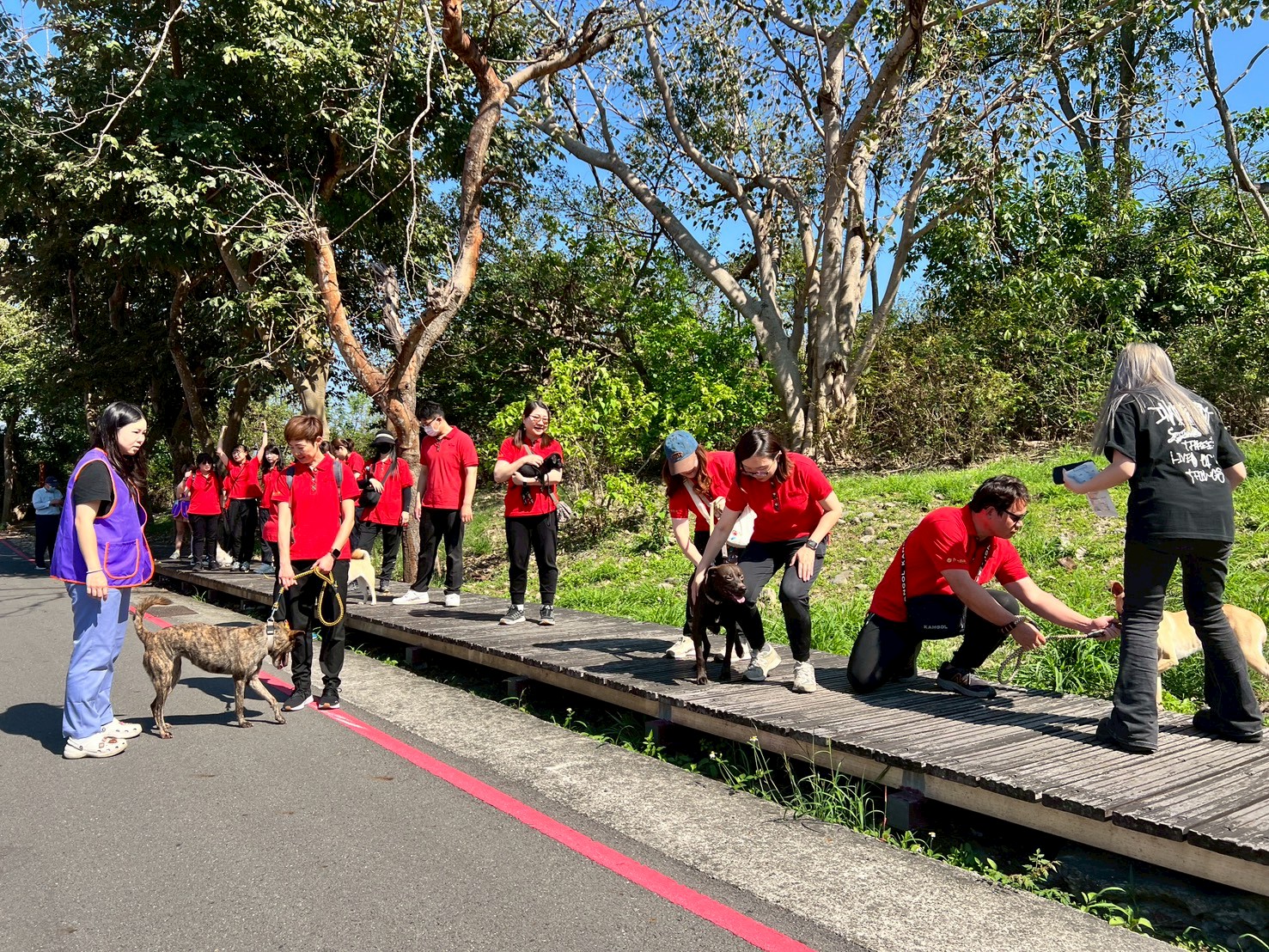 ↑圖說:大遠百同仁帶收容所狗狗外出散步,培養人狗默契。(圖片來源:高雄市動保處提供 )