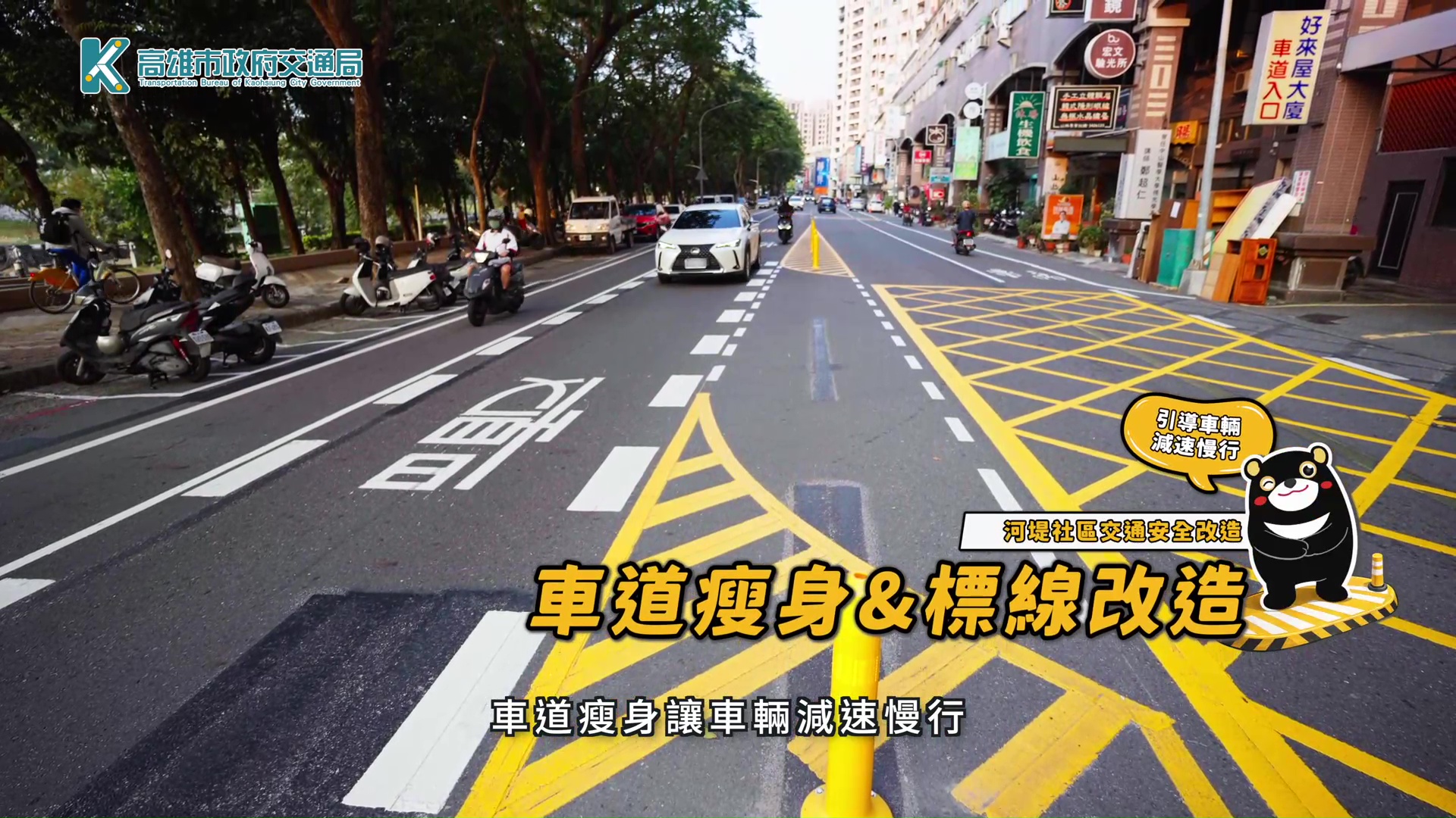 交通局進一步說明,減速平台措施先於澄清湖園區試辦,因減速與警示效果顯著,廣受民眾肯定,因而擴大至三處示範社區施作,同時搭配標線調整進行「車道瘦身」,將部分車道空間回歸行人使用,藉由視覺與空間壓縮,引導駕駛提前降速,逐步建立「車輛慢行、行人優先」的交通文化。