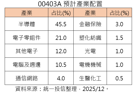 00403A擬任經理人張哲瑋表示,AI促動台灣產業結構華麗轉身,半導體與電子零組件已是台股最重要的兩大命脈。因此,00403A預計以半導體產業作為核心配置,占比約為45%;第二大板塊,則是台灣出口主力之一的電子零組件產業,預計配置比重約20%;並搭配其他電子、電腦及週邊,和通信網路等產業。