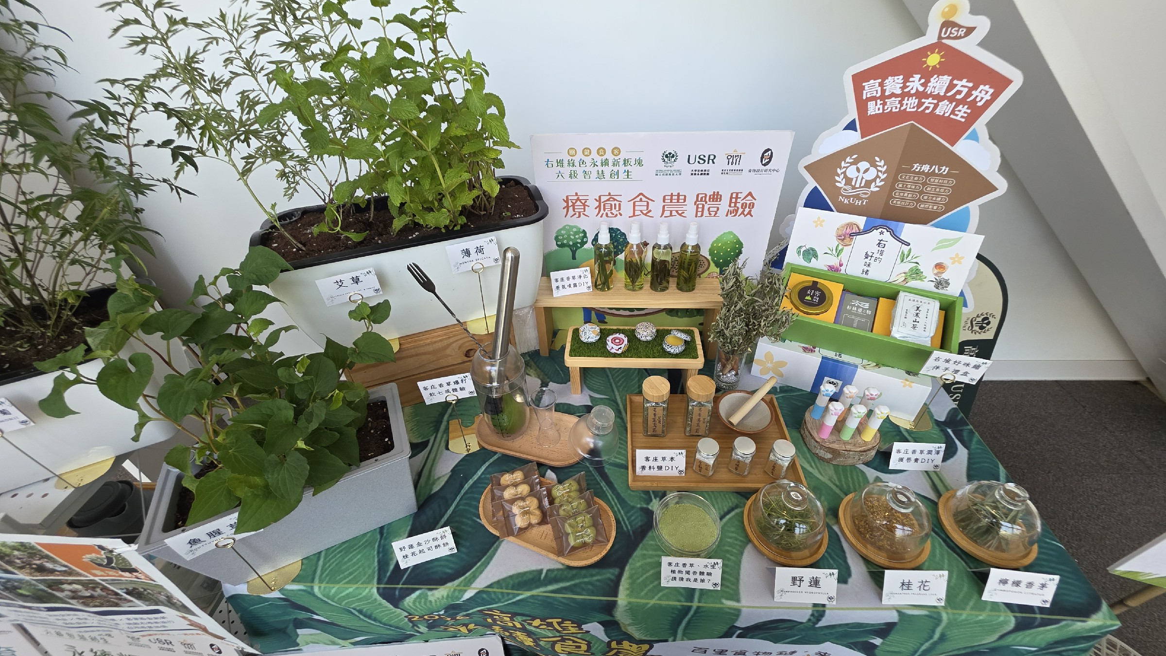 展場內容結合多種在地植物與香草,包括紅花紫蘇草、大葉田香、魚腥草、檸檬香茅與艾草等,透過感官體驗與創意應用,呈現食農教育的多元面向。校方指出,透過「課程設計、實作體驗到反思優化」的教學循環,不僅深化學生學習,也串聯社區與產業,讓食農教育成為地方創生的重要推力。
