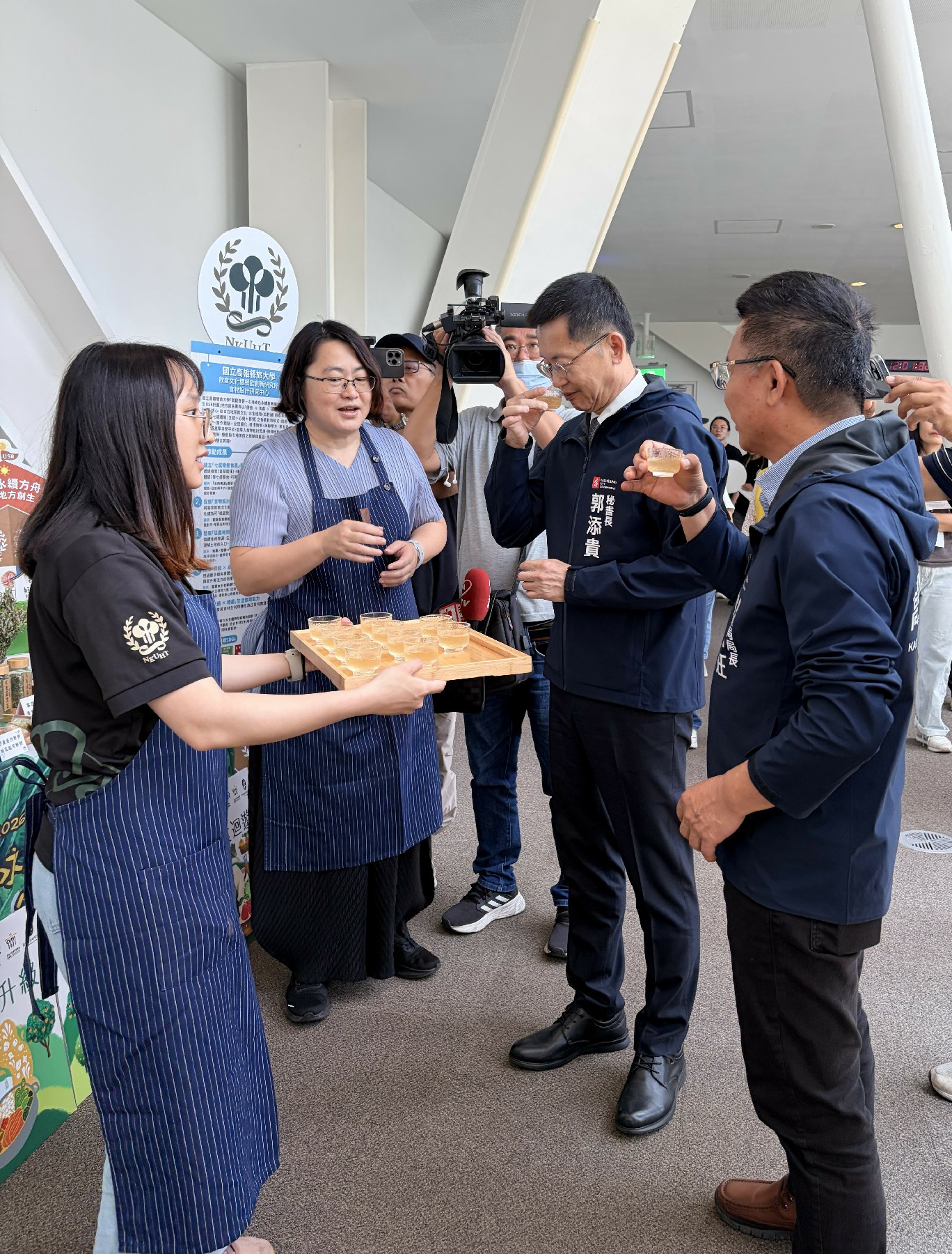 ↑圖說:高雄市政府郭添貴秘書長農業局姚志旺局長品嘗客庄香草爆打飲品(圖片來源:國立高雄餐旅大學提供)