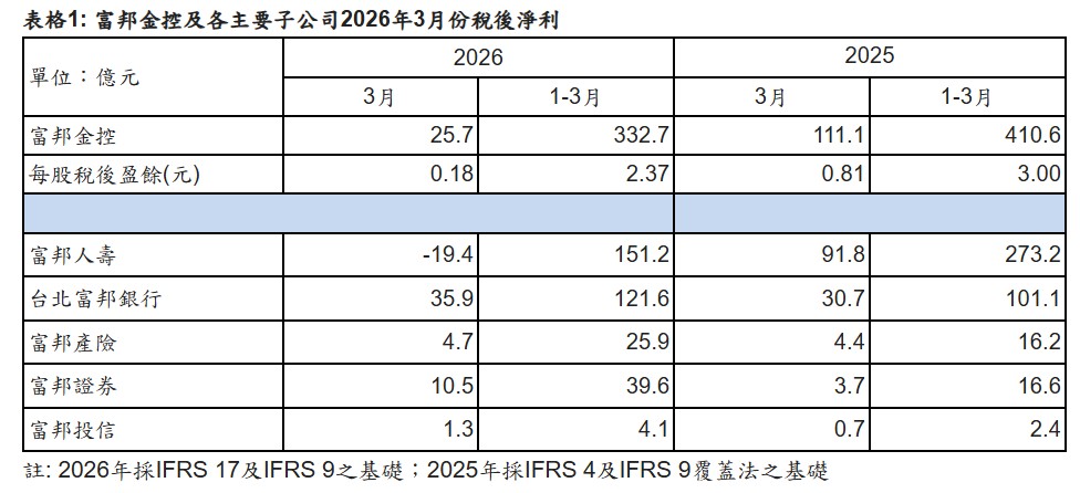 富邦金指出,3月各子公司營運績效優異,其中,台北富邦銀行、富邦證券、富邦投信創單3月及累計前3月獲利歷史同期新高,富邦產險累計前3月為歷史同期次高;富邦人壽調整後獲利則創下單3月及累計前3月歷史同期新高紀錄。