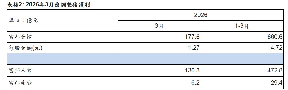若加計透過其他綜合損益按公允價值衡量(Fair Value through Other Comprehensive Income,FVOCI)之股票處分損益,富邦金控3月調整後獲利177.6億元,累計前3月調整後獲利660.6億元,雙雙創歷史同期新高,調整後每股稅後盈餘為4.72元。