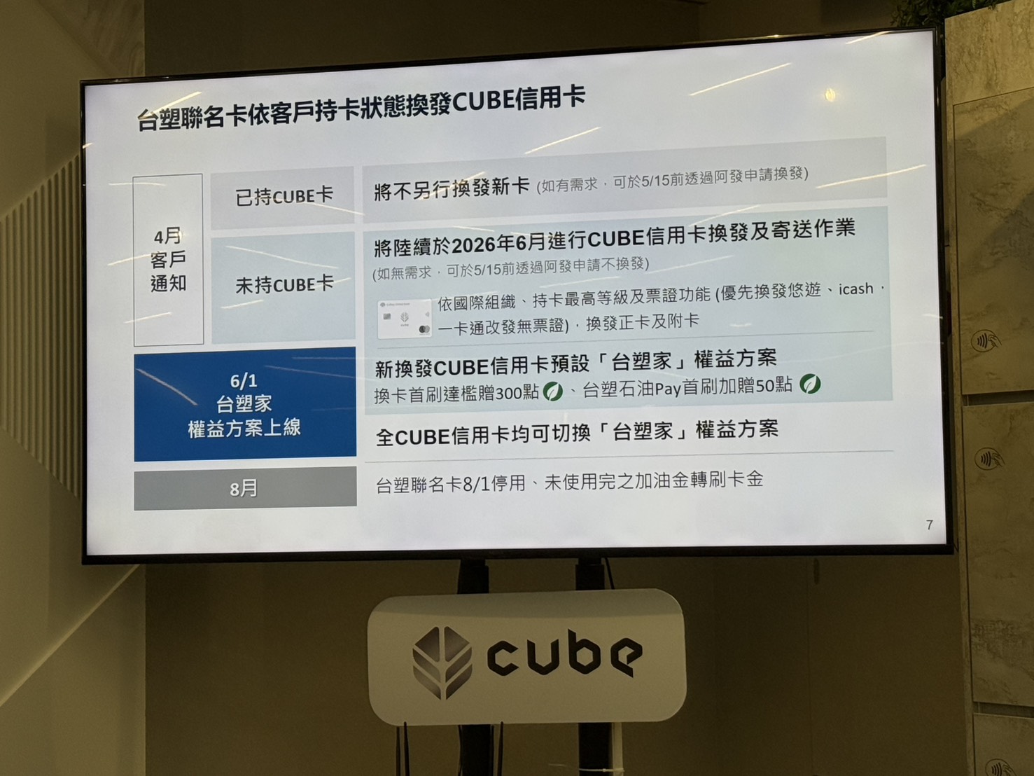 據統計,台塑聯名卡卡友當中,已逾60%卡友同時持有CUBE信用卡;如果沒有換卡需求的,5月15日之前可透過阿發申請不換發。