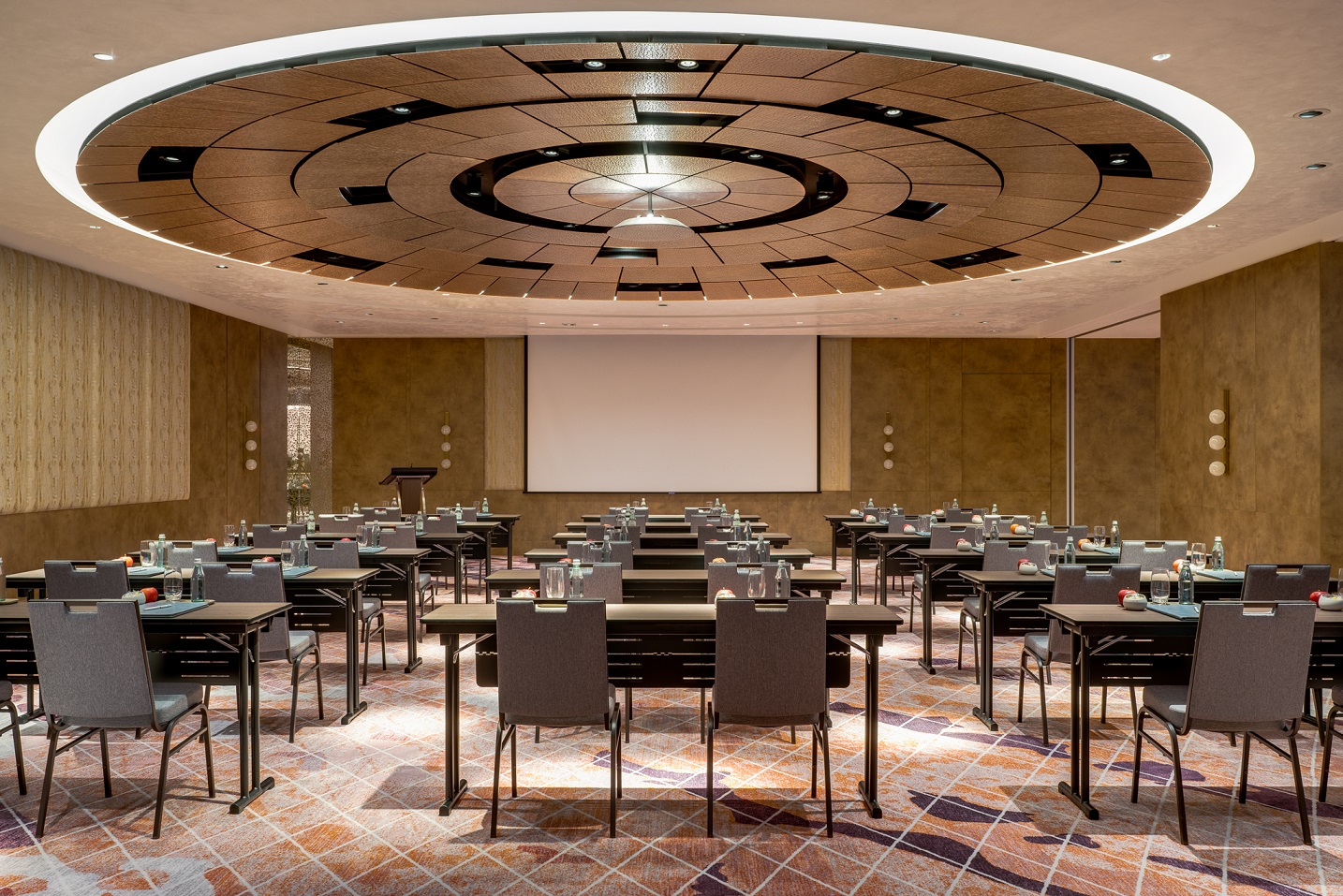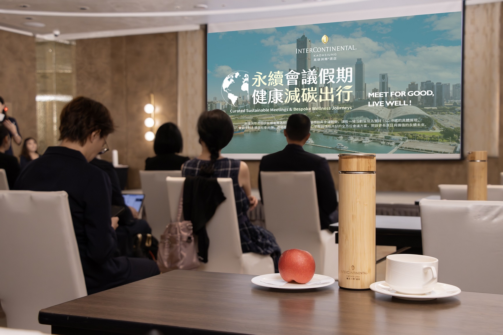 ↑圖說:酒店打破傳統會議框架,將零廢棄理念滲透每個環節,落實無紙化智慧會議機制,並全面取消桌布鋪設,降低洗滌過程中的化學藥劑與能源耗損。(圖片來源:高雄洲際酒店提供)