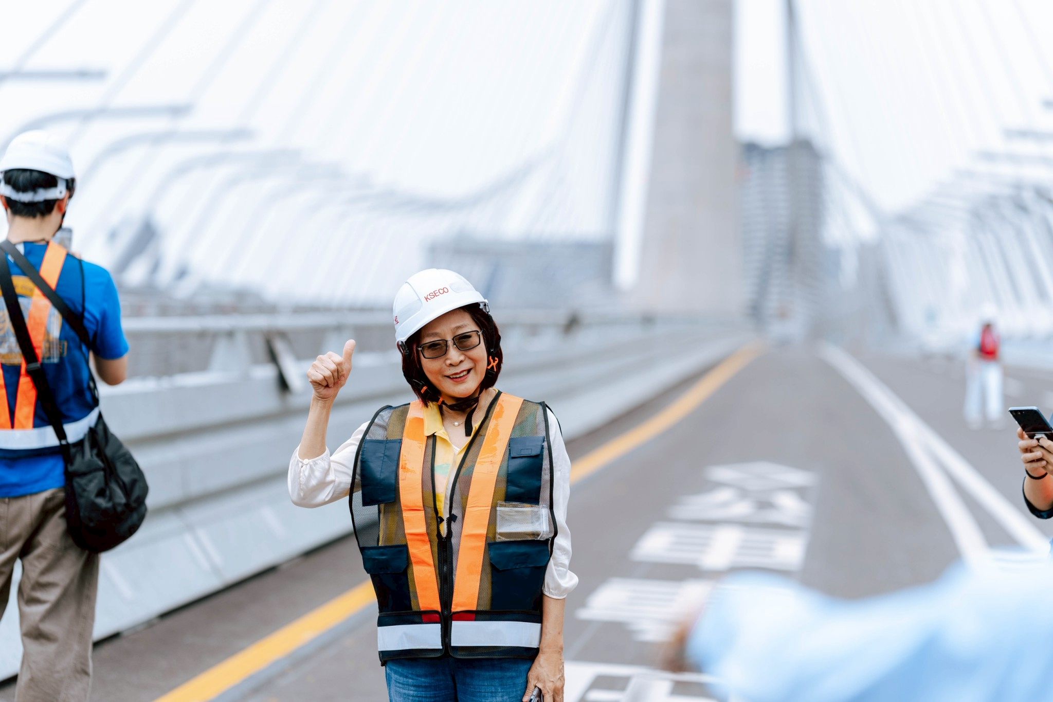 工信工程簡報時表示,淡江大橋歷經30年規劃推動,即將於2026年5月通車,不僅是交通建設,更是融合工程技術與建築藝術的世界級作品。該橋出自英國建築大師札哈哈蒂(Zaha Hadid)團隊之手,她也是首位獲得普立茲建築獎的女性,其流線曲面設計極具未來感與辨識度,設計語彙以高難度聞名,淡江大橋亦被視為具歷史意義的地標工程。