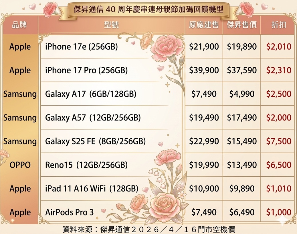 最新上市的iPhone 17e(256GB),傑昇40週年慶祭出破盤價,僅需1萬9890元就能輕鬆帶回家;如果是iPhone 17 Pro(256GB),傑昇通信門市維持現貨供應,優惠價只要3萬7590元,隨時能把驚喜交到媽媽手中。