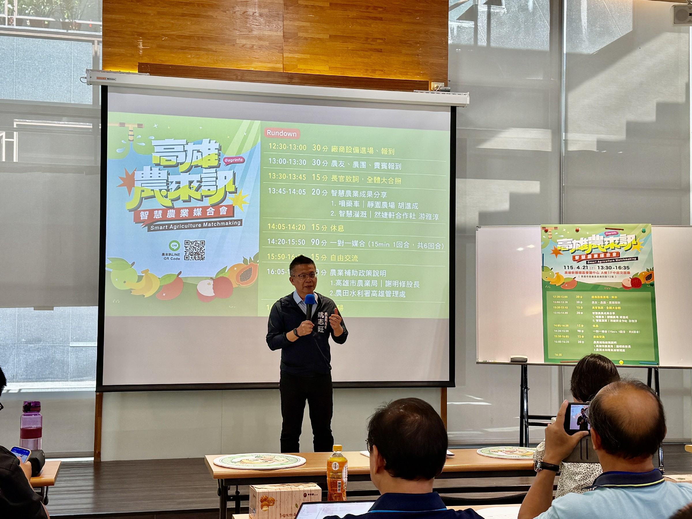 ↑圖說:姚志旺表示,透過媒合會讓廠商及農友們直接面對面討論,期望今年高雄智慧農業案場能累積超過170場、1,400公頃。(圖片來源:高雄市農業局提供)