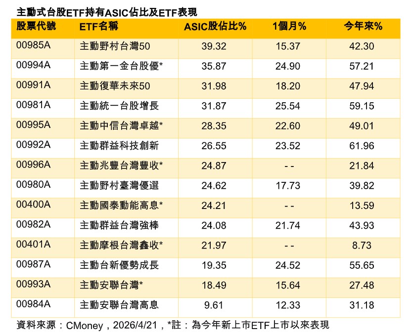 主動式台股ETF發揮主動選股優勢、跟緊熱門投資題材不掉隊,Cmoney統計,目前市場14檔主動式台股ETF,持有熱門ASIC概念股比重大約在20%至30%之間,火力較集中的如:主動野村台灣50(00985A)在ASIC持股比重約39.32%、主動第一金台股優(00994A)佔35.87%、主動復華未來50(00991A)佔31.98%、主動統一台股增長(00981A)佔31.87%。