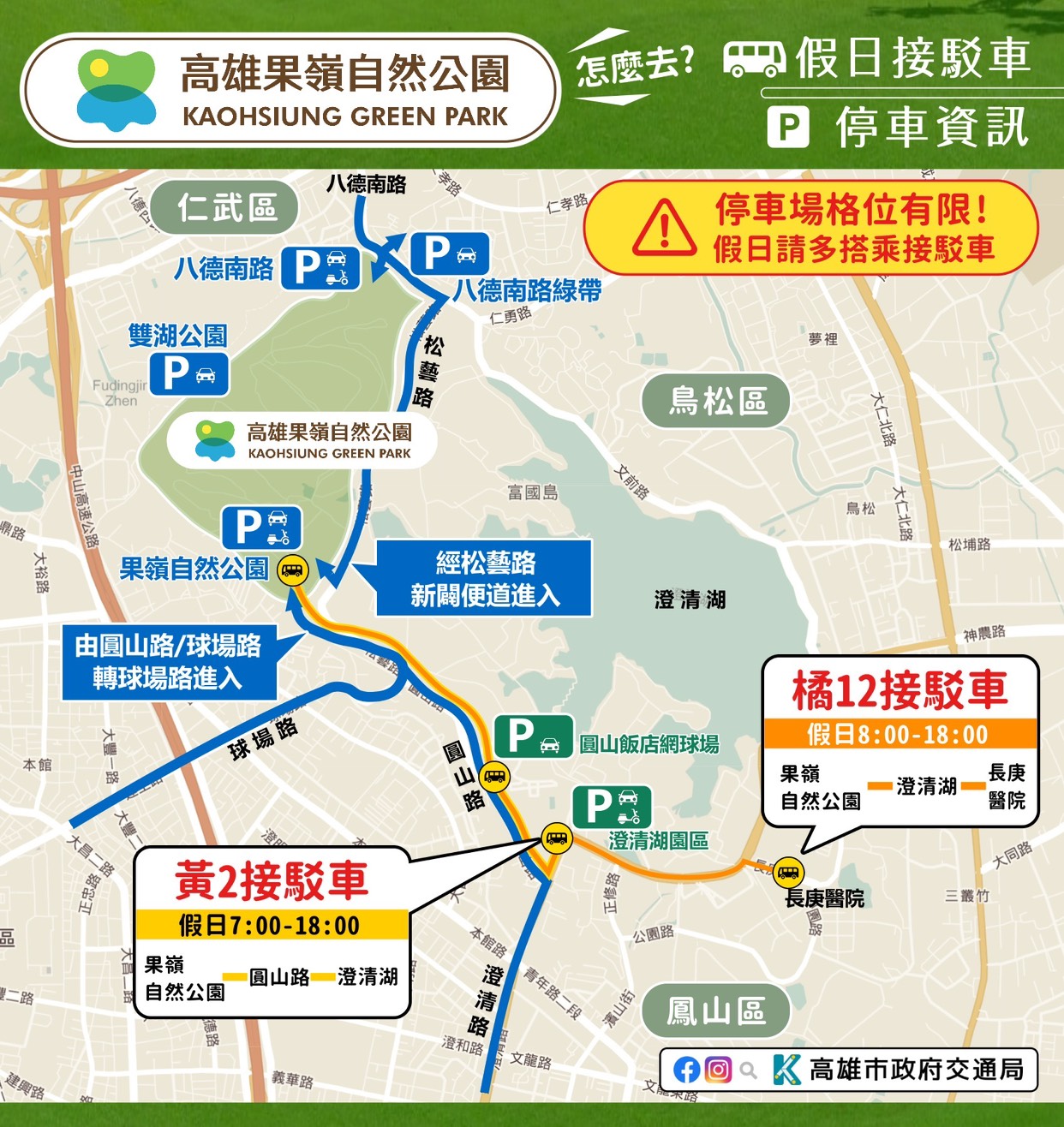↑圖說:假日人潮多,停車位有限,民眾可搭乘假日接駁車(黃2、橘12)或騎乘YouBike前往,以免因停車位有限而壅塞。(圖片來源:高雄市觀光局提供)