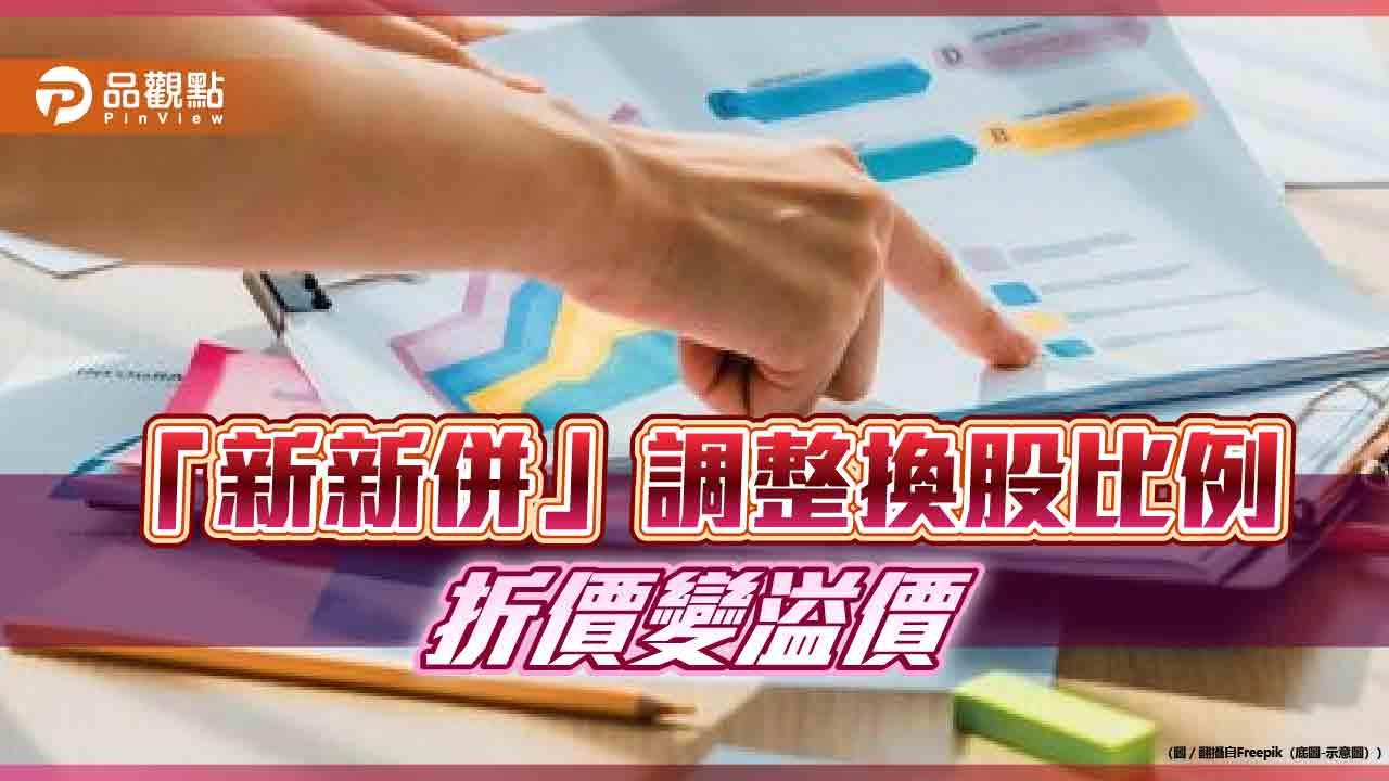 台新金與新光金今晚宣布,雙方董事會通過調整換股架構與價格,由原先的1股新光金換0.6022股台新金,調高為台新金0.672股普通股加計0.175股辛種特別股, 依台新金今日收盤價18.5元和辛種特別股每股面額10元計算,調整後的換股價格為14.18元,相較原訂價格提高25%,也比新光金今天收盤價13.5元,溢價5%。
