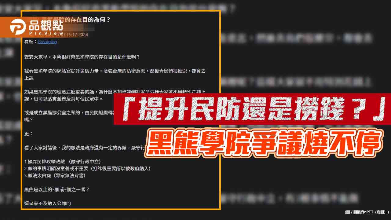 近日,黑熊學院的存在與定位在ptt掀起熱烈討論。有網友質疑其是否應由政府主導,進一步納入課綱或轉為政府部門推行,以真正落實提升全民防衛意識的目標。