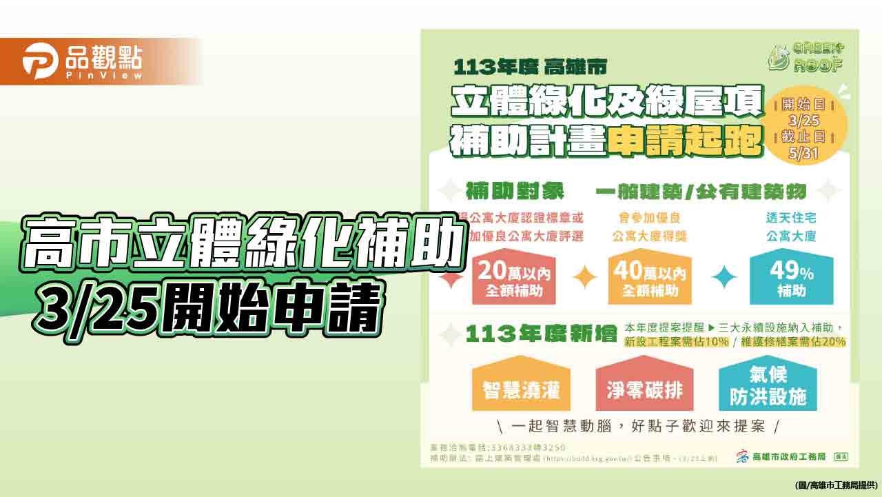 高市府推動邁向淨零碳排為全國之率先楷模,為推動綠化政策,工務局於7月4日起受理114年度第二階段建築物立體綠化及綠屋頂補助申請,補助申請於8月5日前截止,最高補助額度80萬元。