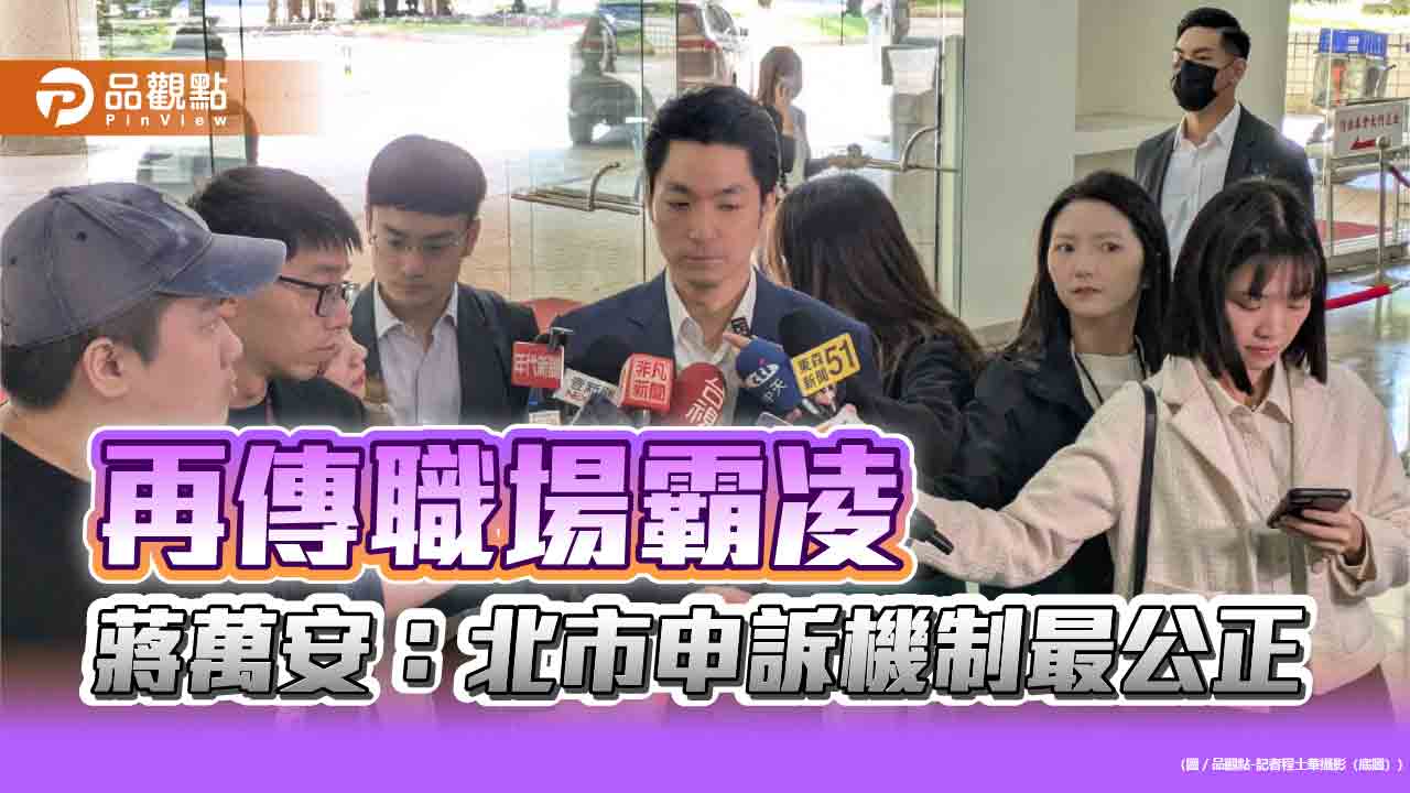 社會關注公務體系職場霸凌議題,台北市長蔣萬安今(29)日持續赴議會接受市政總質詢,議員持續踢爆,台北表演藝術中心等單位也傳職場霸凌,蔣萬安對此回應,面對職場霸凌,除了舊有的申報系統,今年還改制規定,至少三分之二必須是外部委員,相信北市率全國之先,在整個申訴機制上是最好、最公正的。