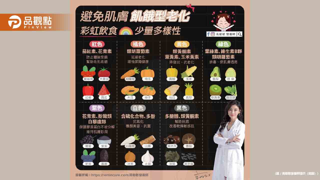 比起一大堆的瓶瓶罐罐,營養師更希望你們吃天然食物,避免皮膚的飢餓型老化,想過嗎?你每天吃的食物都可以分成這麼多顏色,建議大家一天要吃五種顏色以上的天然食物。