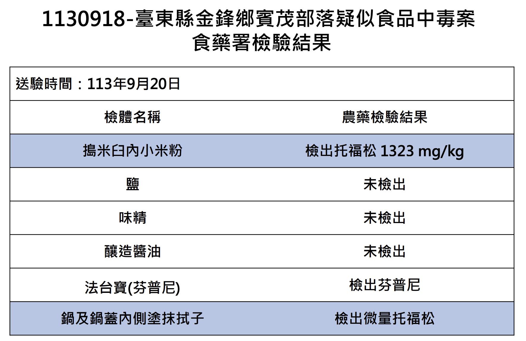 台東縣近日發生疑似小米粽食物中毒事件,已造成3人死亡。衛生福利部食品藥物管理署最新檢驗結果顯示,涉案的搗米臼內殘留小米粉,驗出高達1323毫克/公斤的托福松農藥,另外在蒸煮鍋的塗抹拭子中也檢出微量托福松。