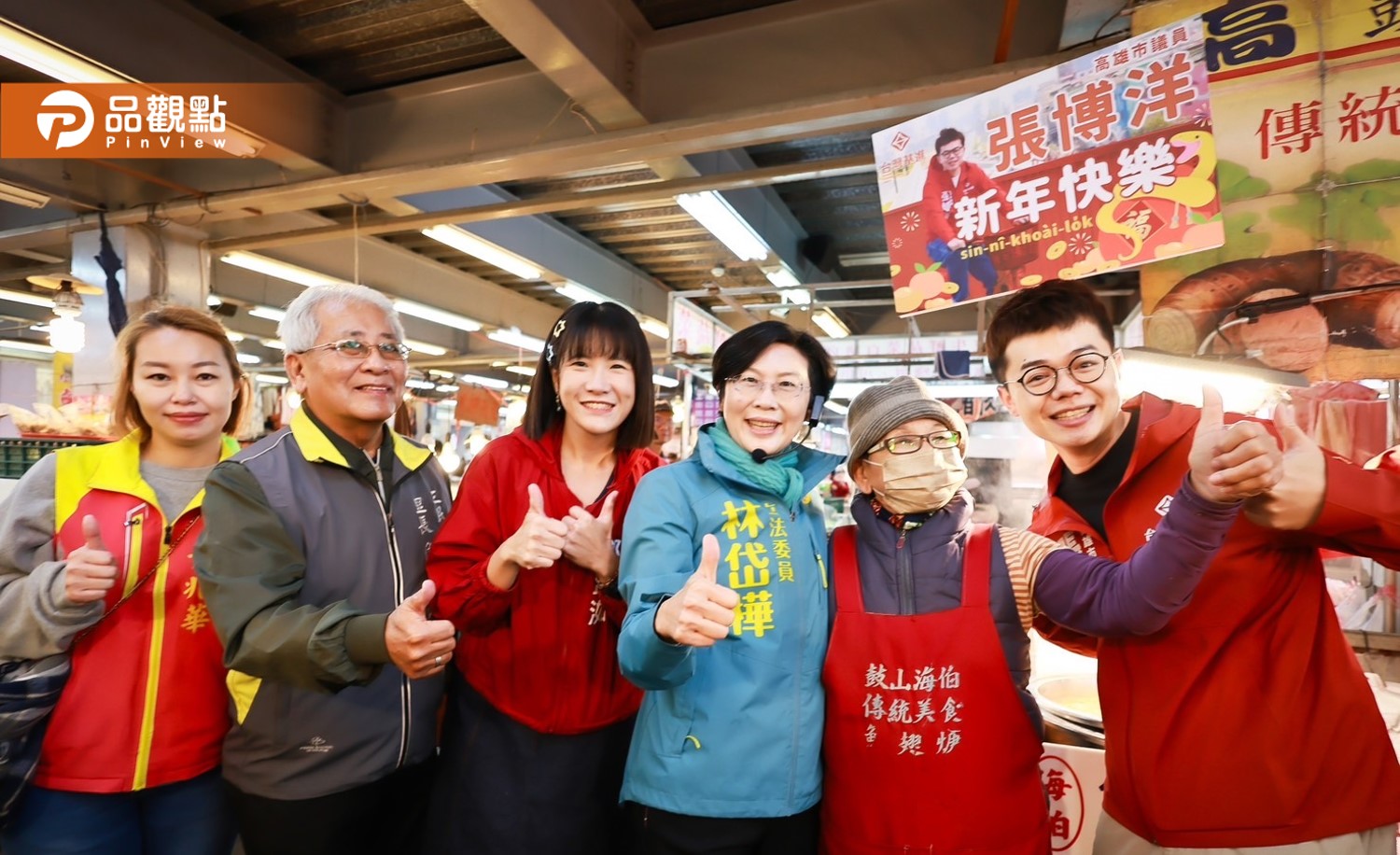 立法委員林岱樺18日前往三民區陽明市場,與當地民進黨議員鄭孟洳、基進黨議員張博洋,向早市的攤商與民眾拜早年。三民區數位里長也全程陪同。